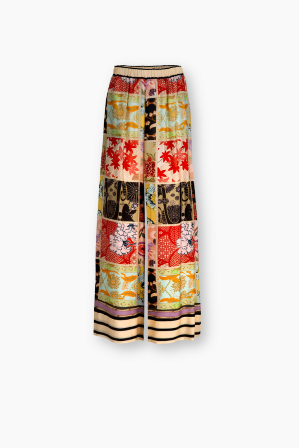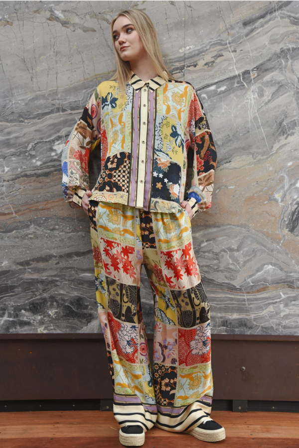 Effortless ease meets fluid movement in the ‘Stretch a Leg’ Pant, crafted in our 'In the Square Tonight' viscose satin with a vibrant patchwork print. A wide leg silhouette drapes beautifully, complemented by an elasticated waistband for comfort and side pockets for practicality. Perfect for dressing up or down, it’s a versatile wardrobe staple.