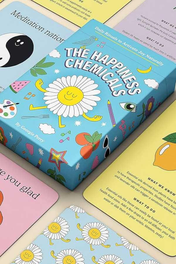 The Happiness Chemicals: Daily Rituals to Activate Joy is a vibrant deck of illustrated cards that will teach you how to stimulate your four happiness chemicals from within: dopamine, serotonin, endorphin and oxytocin. Pull one card a day and happiness will follow!